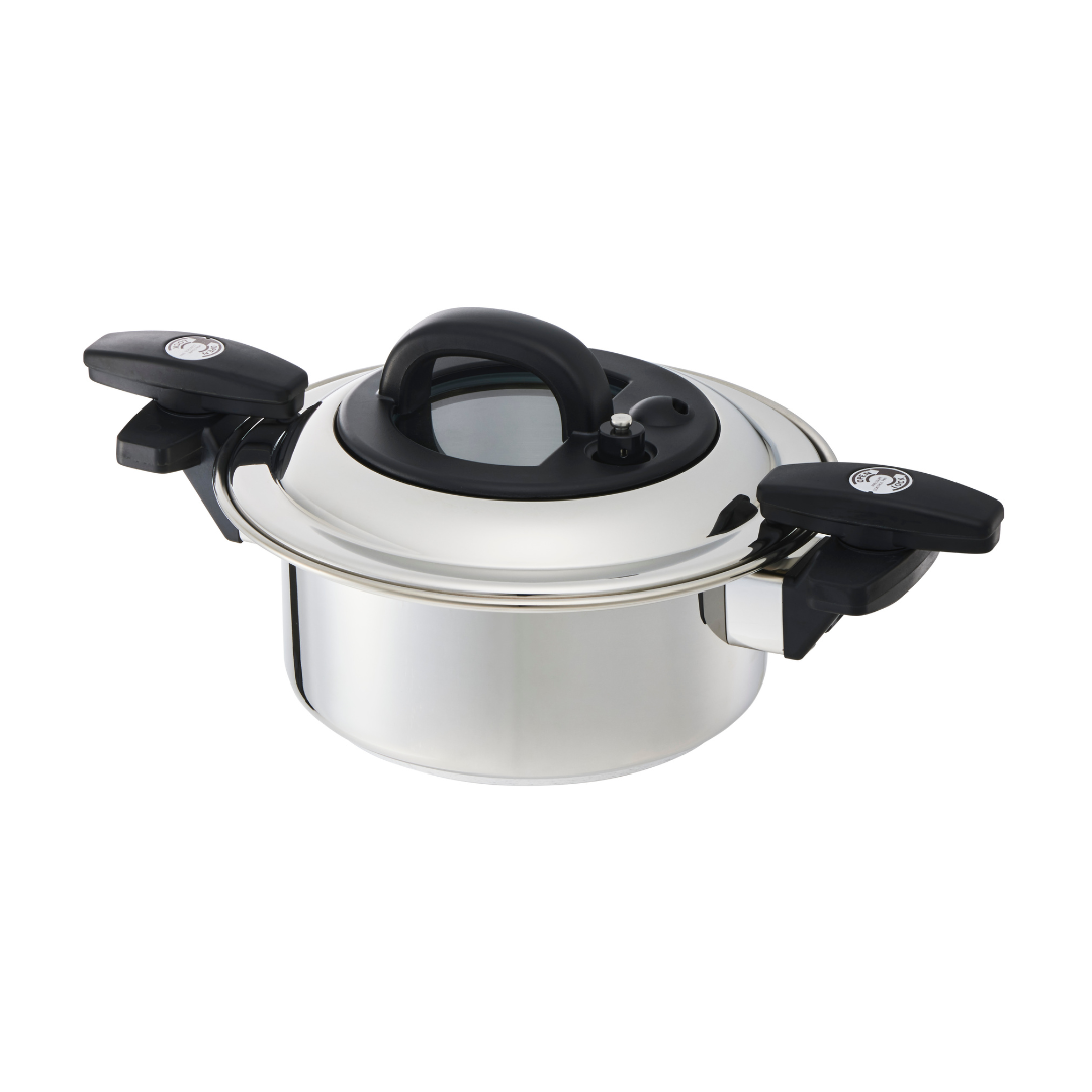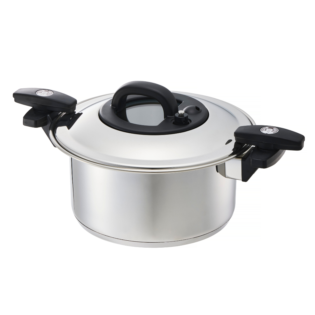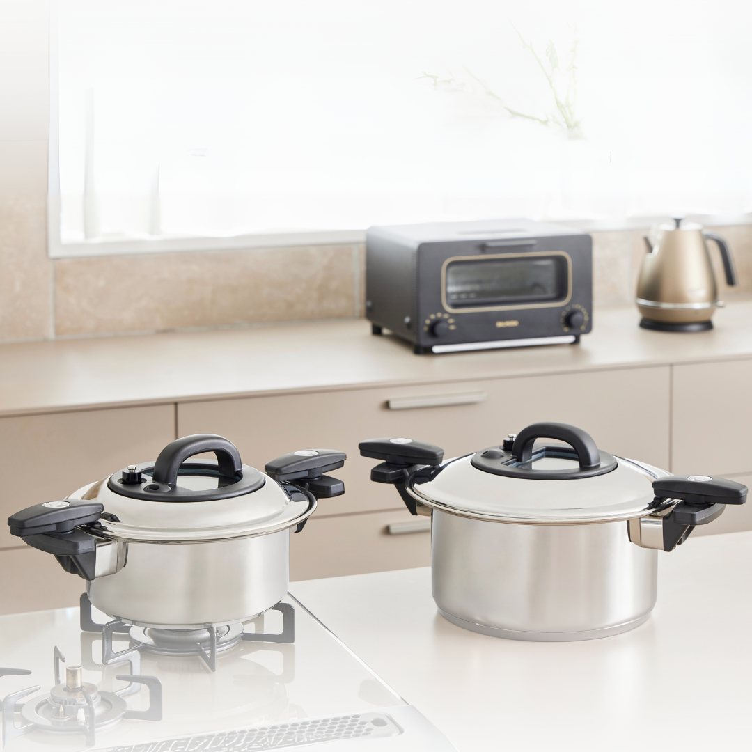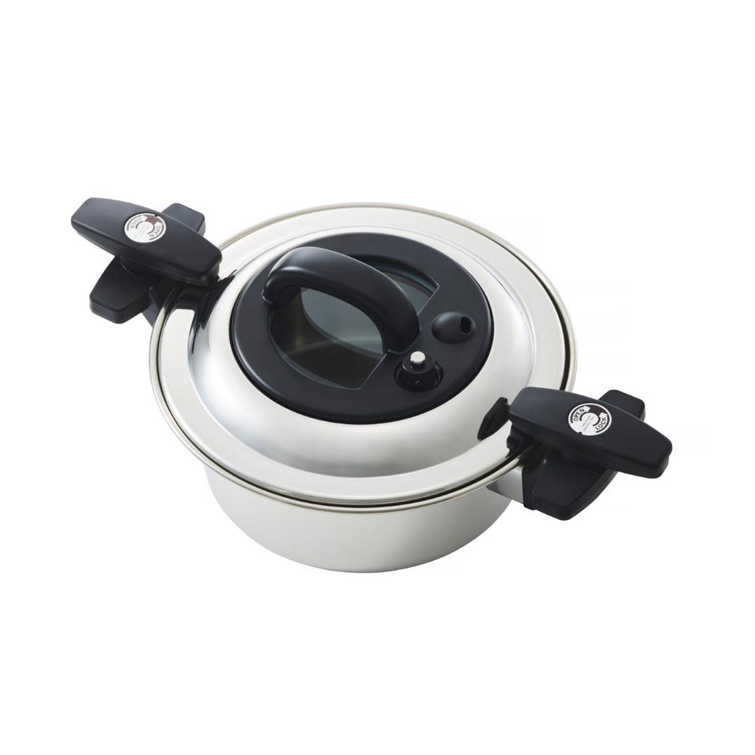 鍋本体のハンドルをロックすると、フタと鍋の隙間が埋まり、優しい密閉状態になります。ここに熱を加えることで、調理に適したほど良い圧力が生み出されます。